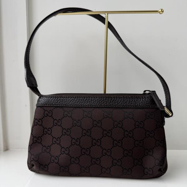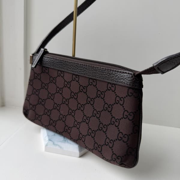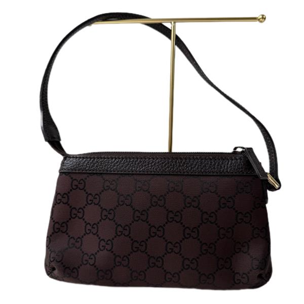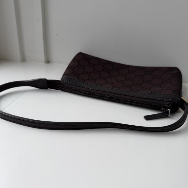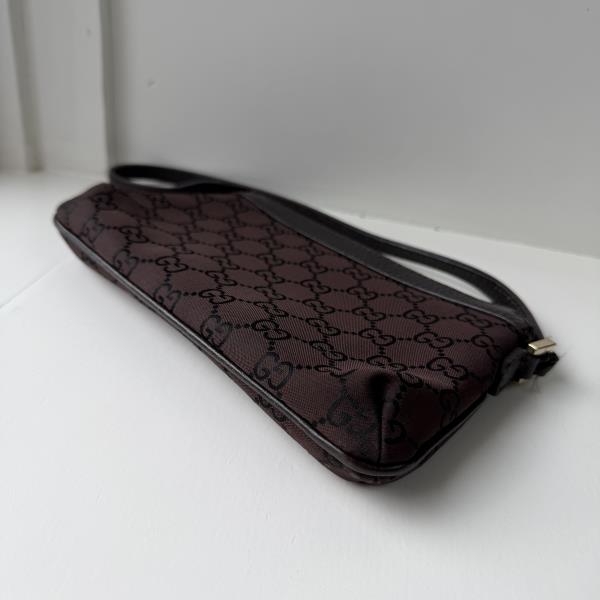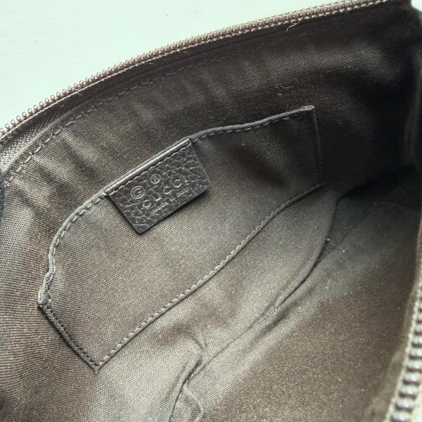 Gucci Handbag GG Canvas brown/black. This is an authentic GUCCI Monogram Small Pochette bag. This small but useful bag features beige monogram canvas on the outside and a small leather strap for easy carry. The zipper opens to a spacious interior. This is an on-trend mini bag is versatile and stylish, by Gucci! This bag is in very good vintage condition. Measurements [Size (H x W x D)]: 12cm x 21 cm x 4cm.